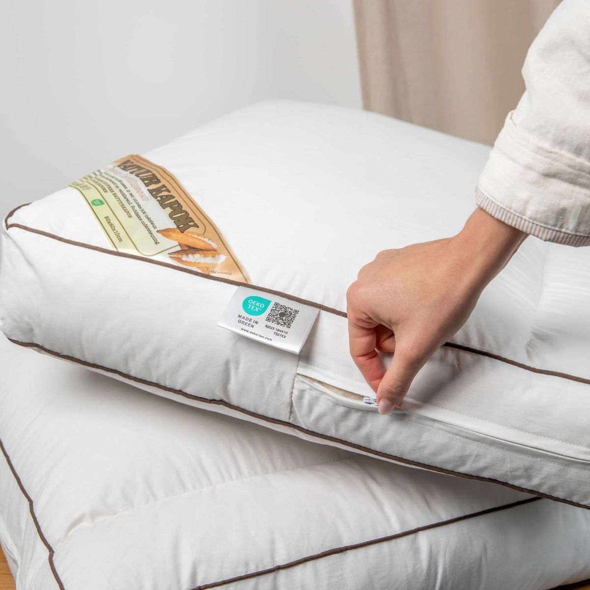 Kapok Neksteun Hoofdkussens zijn voorzien van een gecertificeerd Oeko-Tex Made In Green label.