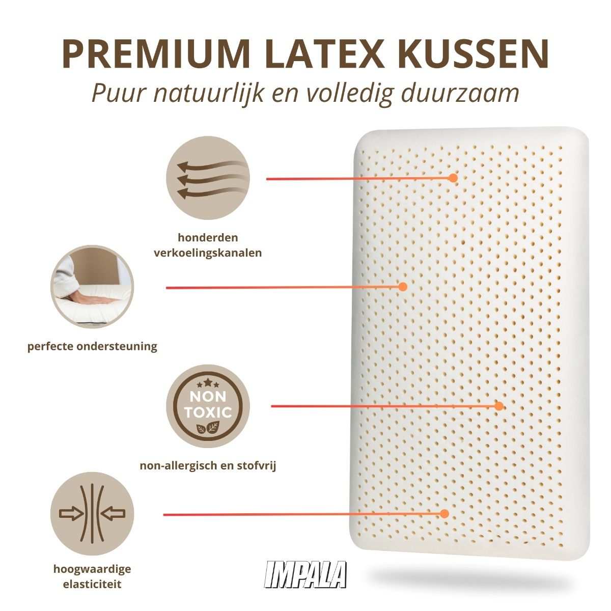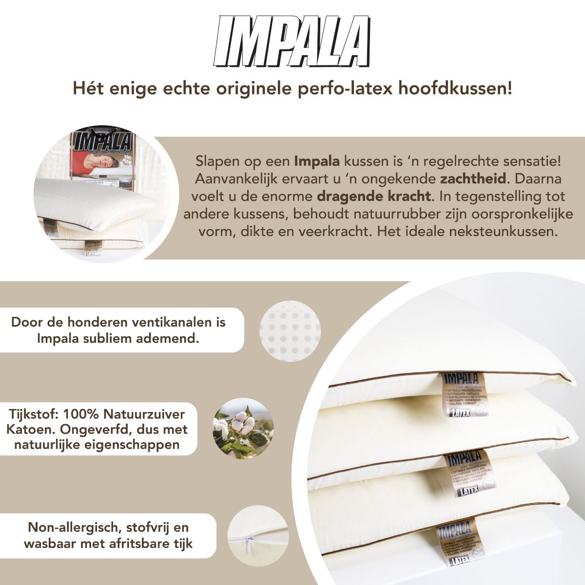 De Impala hoofdkussens zijn vervaardigd van puur en zuiver natuurrubber; 'n edel en kostbaar materiaal met imponerende veerkracht, die het hoofd en de nekholte in elke slaapstand in een natuurlijke balans brengt. NatuurLatex komt uit ’n boom, dus is puur natuur. Deze natuurlijke “levende” Latex-natuurrubber kent als enige grondstof een lineair toenemende druk. Het gaat dus steeds krachtiger tegendrukken, naarmate wij het gaan indrukken. Dit in tegenstelling tot alle andere “dode” kunststof materialen. Bovendien is dit natuurproduct ultra-elastisch, anti-bacteriëel, anti-allergisch, stofvrij, hyper-allergeen en onvermoeibaar veerkrachtig