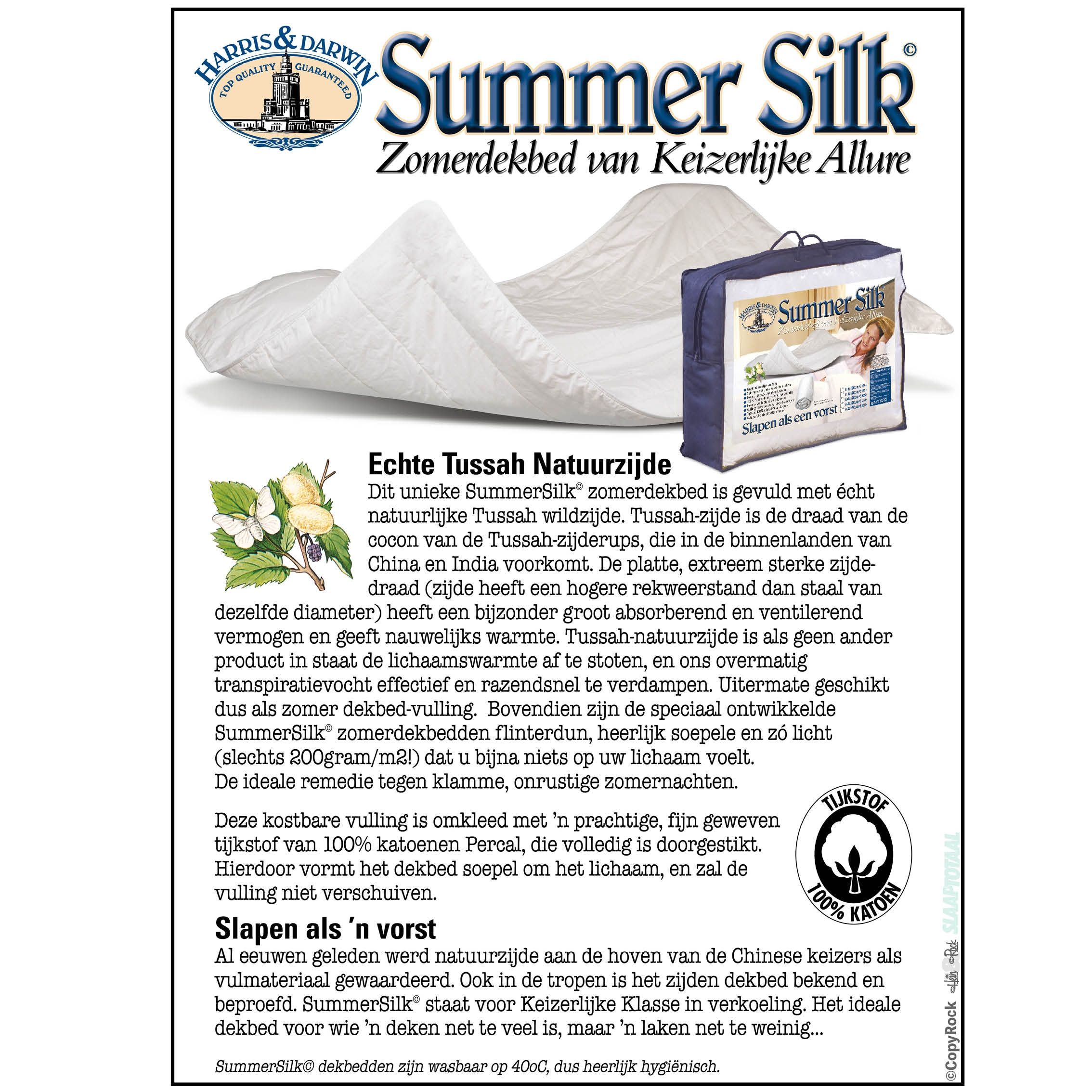 De speciaal ontwikkelde SummerSilk© zomerdekbedden flinterdun, heerlijk soepele en zó licht (slechts 150gram/m2!) dat u bijna niets op uw lichaam voelt. De ideale remedie tegen klamme, onrustige zomernachten. Deze kostbare vulling is omkleed met ’n prachtige, fijn geweven tijkstof van 100% katoenen Percal, die volledig is doorgestikt. Hierdoor vormt het dekbed soepel om het lichaam, en zal de vulling niet verschuiven.