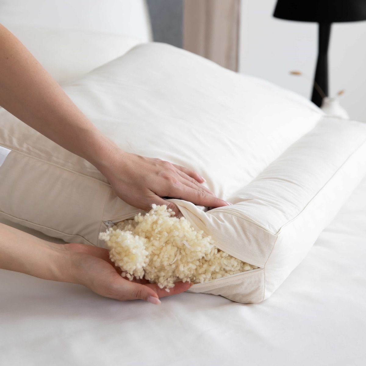 Deze luxe Wollen neksteun kussens worden geleverd in ’n ademende draagtas, waarin u het kussen stofvrij, fris en ademend opbergt.