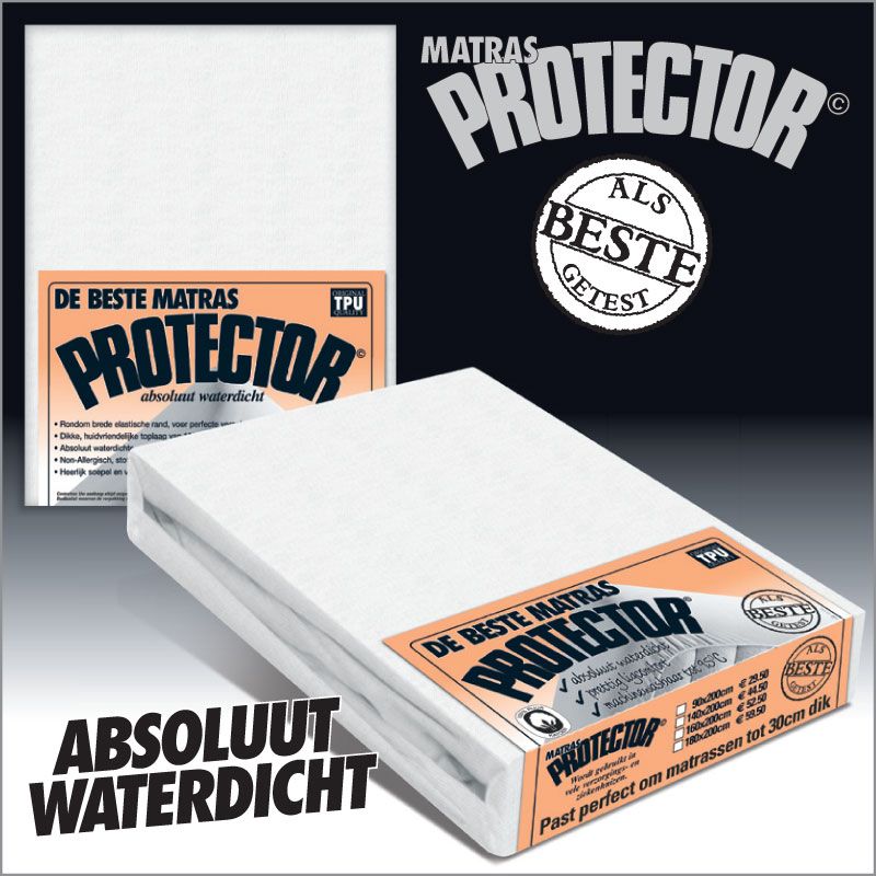 Waterdichte matrashoes ter bescherming van uw matras. Dit absoluut waterdichte Protector© hoeslaken (als beste getest door hospitalen!!) heeft een beschermlaag van kraakvrije en krakkeleer-vrije TPU, en een behaaglijk ademende toplaag van 100% katoenen molton. Het hoeslaken heeft een perfecte pasvorm voor matrassen tot 30cm dik en is voorzien van rondom elastiek. Op 90oC machine wasbaar en ultrasnel drogend. Een zeer hoogwaardig product, voor aangenaam ligcomfort.