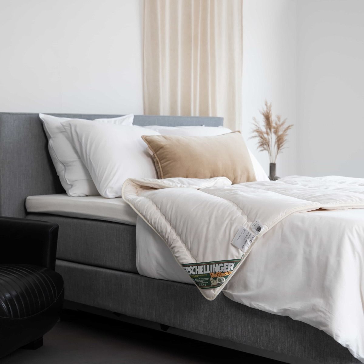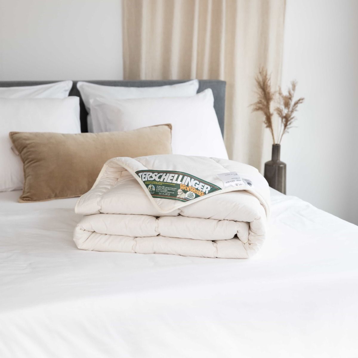 Het behaaglijk warme winterdekbed uit de beroemde Terschellinger© familie. Gevuld met fijn gerulde pure schapenwol. De extreem gekroesde wol-kwaliteit vormt ’n luxe laag van miljoenen luchtkussentjes, die zorg dragen voor optimale ventilatie (Terschellinger© dekbedden zijn nooit broeierig), onovertroffen vochtregulatie en een unieke warmtespreiding. De gekaarde wol wordt zo behandeld, dat alle natuurlijke ingrediënten (zoals Lanoline) behouden blijven, zodat de unieke werking van wol volledig gehandhaafd blijft. De fantastische Terschellinger© dekbedden zijn voorzien van ’n bijzonder fraaie bekledingsstof. Uiteraard vervaardigd van 100% puur katoen, volledig doorgestikt in banen, zodat de edele vulling nooit kan verschuiven en het dekbed soepel om het lichaam voegt.